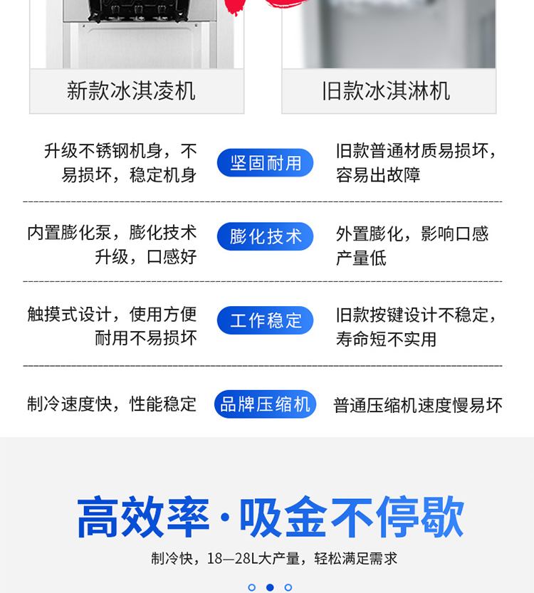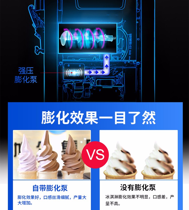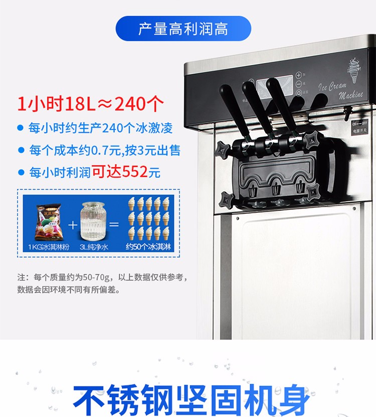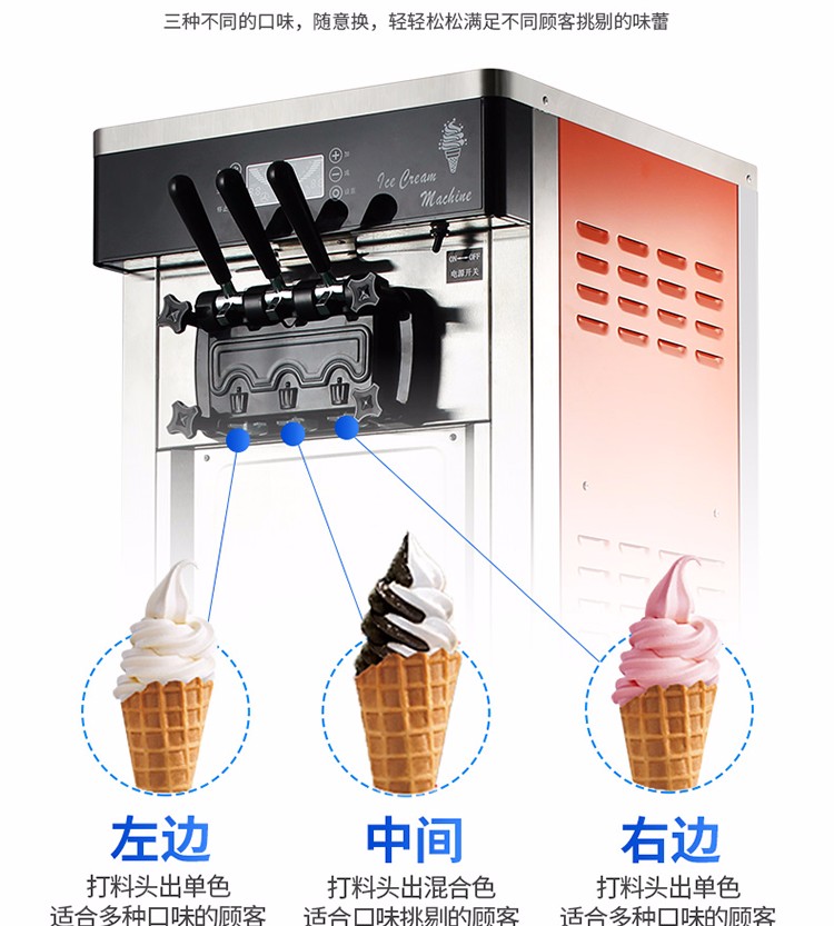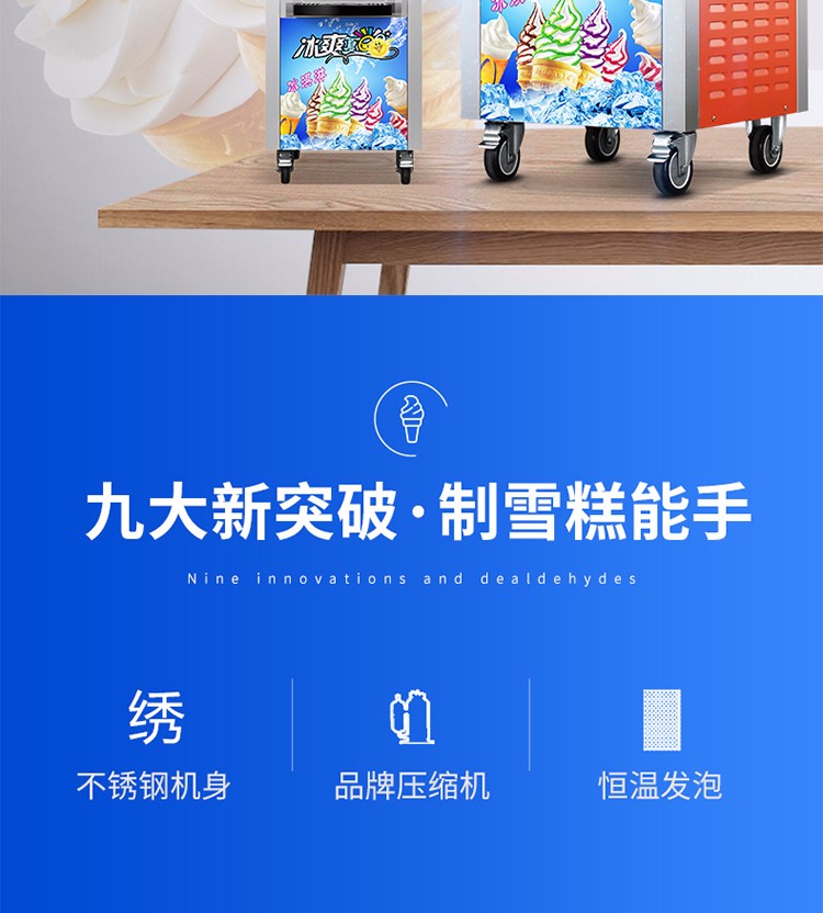 名稱BQL-828冰淇淋機(jī) 電源220V 功率2.2kw 產(chǎn)量18-28L/h 尺寸540×590×1360mm 重量118kg 規(guī)格顏色:銀色,桔色,土豪金 其他