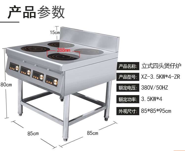 名稱座地式四頭電磁爐 電源 功率3.5kw*4 產量 尺寸850×850×800/950mm 重量 規格 其他