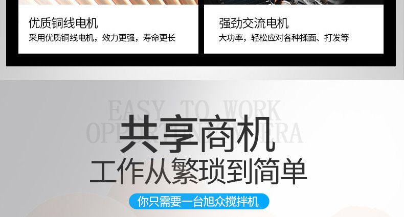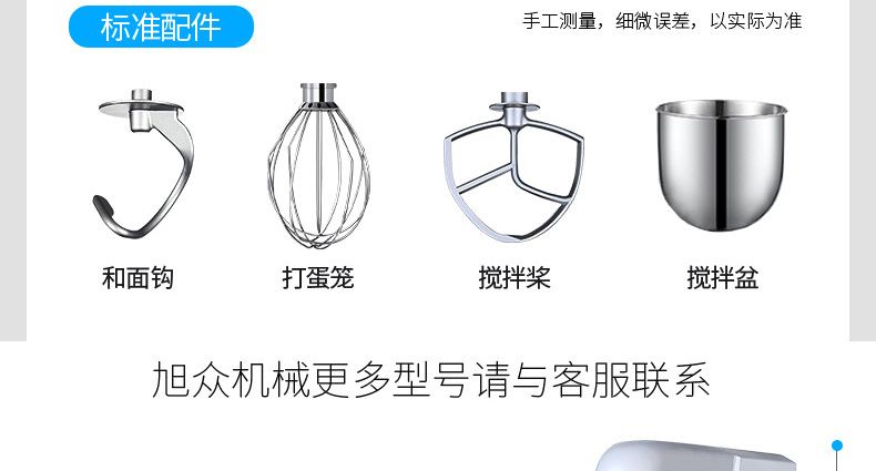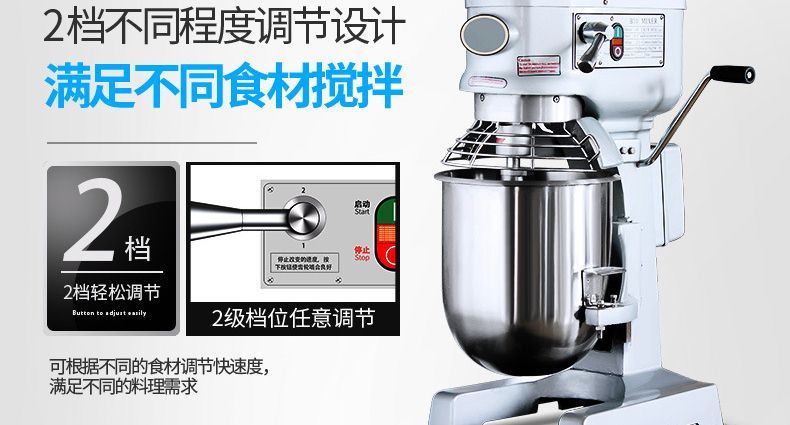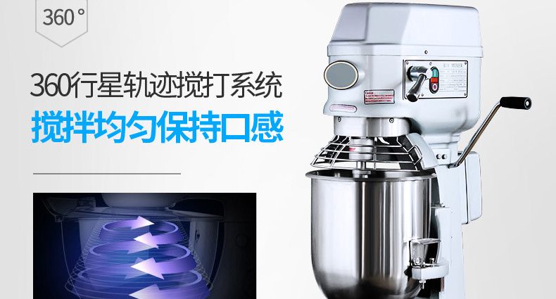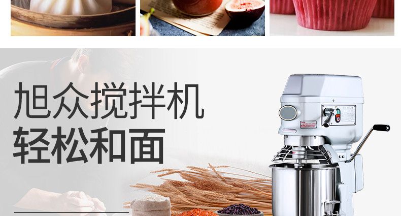 旭眾牌新款A系列食品攪拌機運用行星運動原理,攪拌器在料桶內做行星運動,從而使食品充分混合,具有和面、攪和碎狀。粉狀及液狀食品等多種功能,機器工作平穩,設有防護罩,安全可靠,設有多級轉速,并配有多種攪拌器,用戶可按不同要求選擇適當的速度和攪拌器,以實現和面、拌餡、打蛋等功能。機內凡接觸食物的零部件均采用不銹鋼制造或經特殊表面處理。符合食品衛生標準。