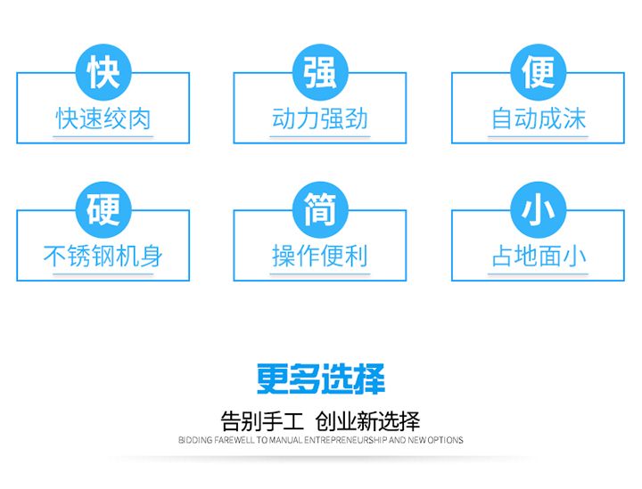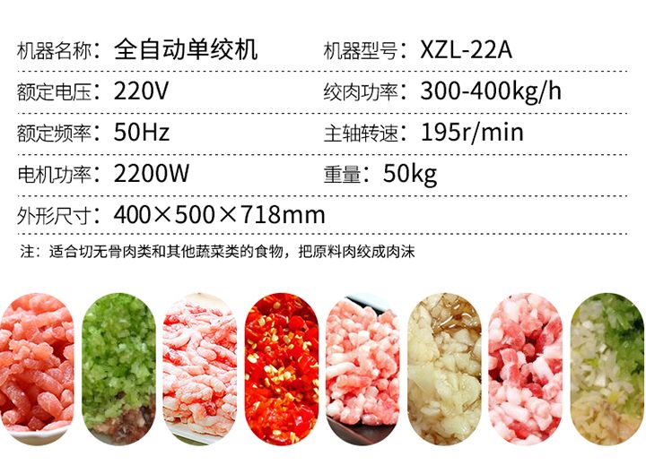 名稱XZL-22A絞肉機 電源220V 功率2.2kw 產量300-400kg/h 尺寸400×500×718mm 重量50kg 規格 其他