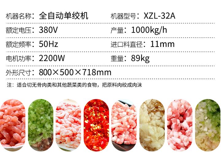 名稱XZL-32A絞肉機 電源380V 功率2.2kw 產(chǎn)量450-500kg/h 尺寸800×500×718mm 重量69kg 規(guī)格 其他