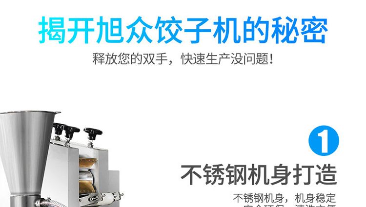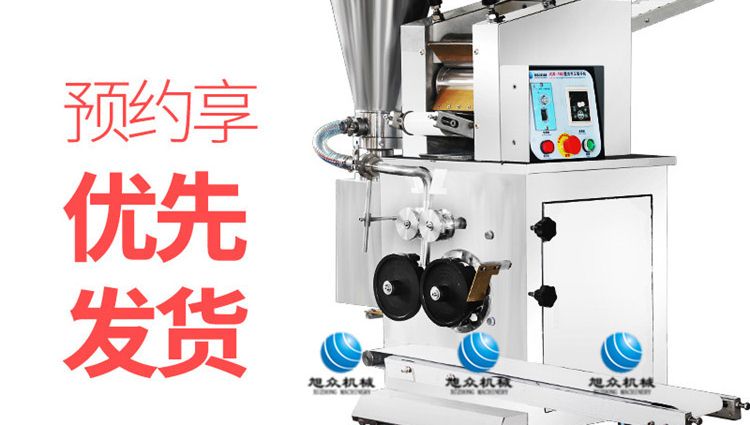 旭眾牌JGB-180型仿手工餃子機是我公司開發生產的先進的自動餃子生產設備。設備包括主動壓皮部分、自動供餡部分、自動包合成型部分、自動成品輸送部分,并且只要更換模具,就可制鍋貼等食品。