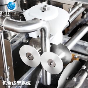 ?采用雙控雙向同步定量供料的方式,生產(chǎn)時(shí)只需將面團(tuán)與餡料放入指定入口,開機(jī)即可自動(dòng)生產(chǎn)出餃子;
