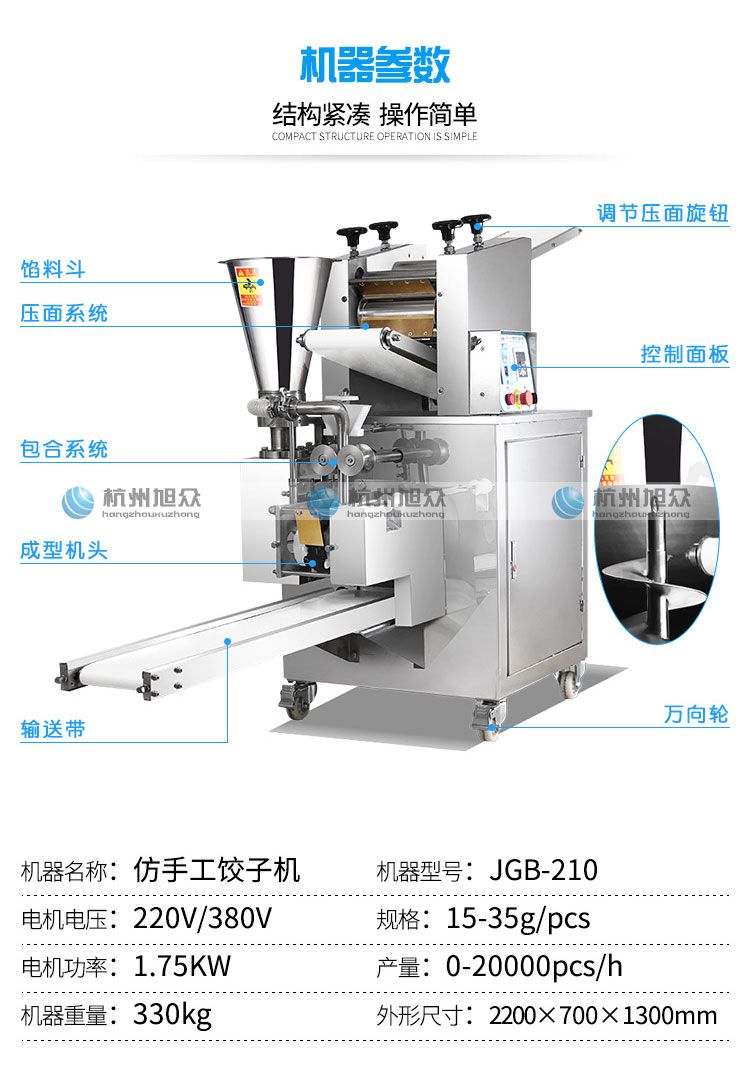名稱JGB-210型仿手工餃子機(jī) 電源220/380V(見(jiàn)機(jī)器名牌) 功率1.75kw 產(chǎn)量0-20000個(gè)/小時(shí) 尺寸2220×700×1300mm 重量330kg 規(guī)格15-35克/個(gè) 其他