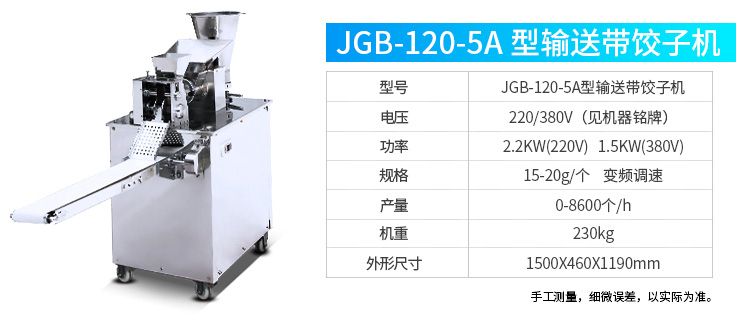 名稱JGB-28型小型餃子機 電源220V 功率65W 產量0-1500個/h 尺寸350×370×700mm(加料斗) 重量45kg 規格 其他