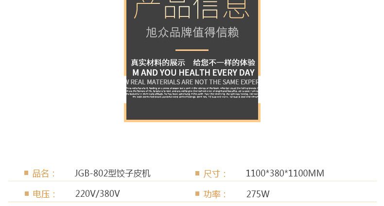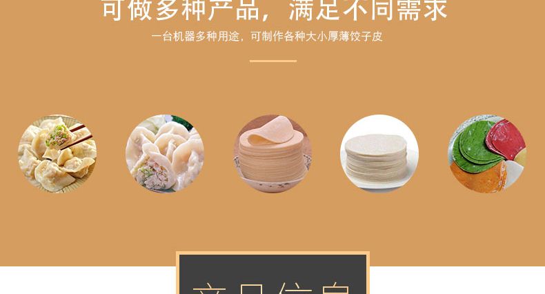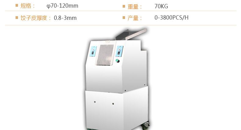 名稱JGB-802型餃子皮機 電源220/380V 功率275W 產量0-70/min 尺寸1100×380×1100mm 重量70kg 規格70-120mm 其他