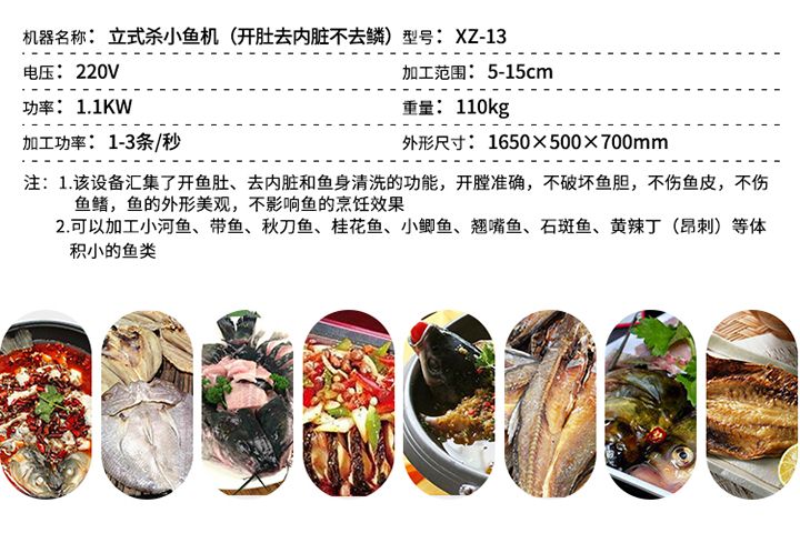 名稱XZ-13型立式小殺魚機(jī)(開肚不去鱗) 電源220V 功率1.1kw 產(chǎn)量1-3條/秒 尺寸1650x500x700mm 重量110kg 規(guī)格5-15cm 其他