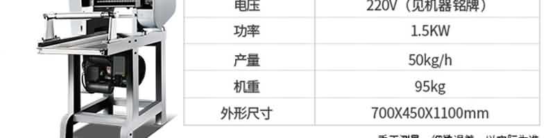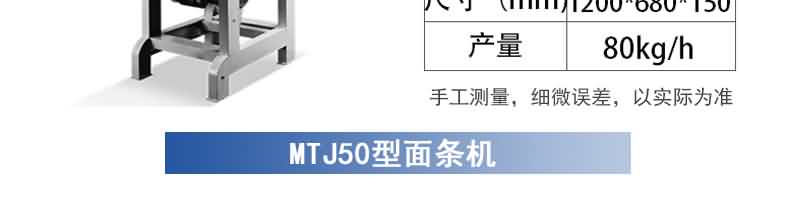 名稱MTJ-50面條機(卡把式) 電源 功率1.5kw 產量50kg/h 尺寸700×450×1100mm 重量95kg 規格 其他