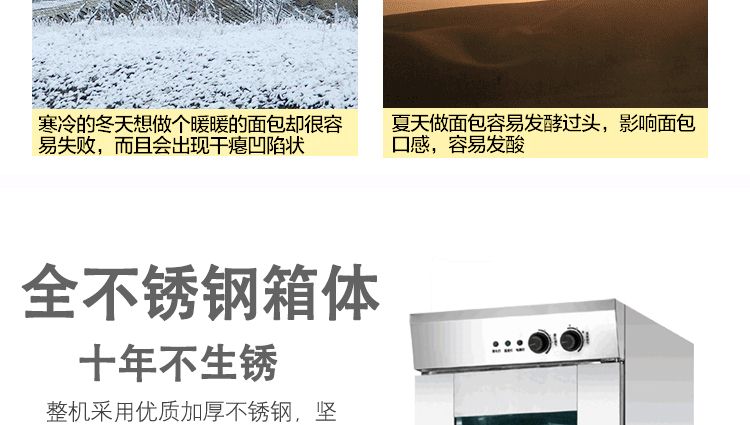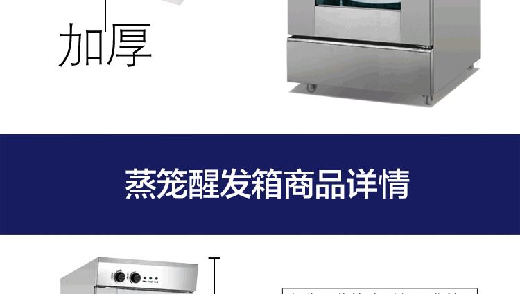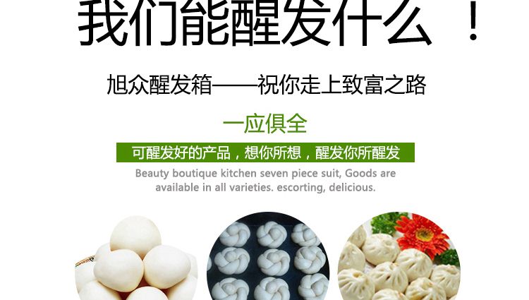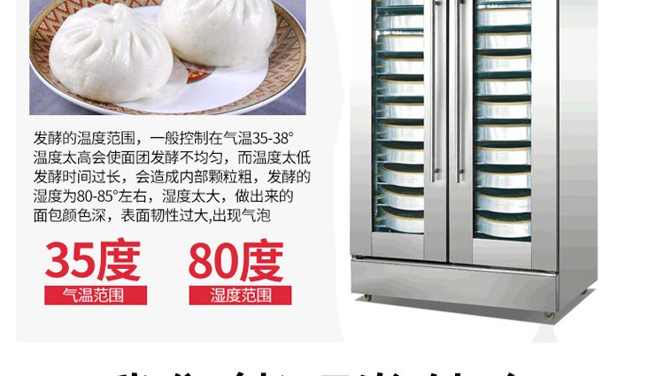 旭眾蒸籠醒發箱采用全不銹鋼制成,利用電熱管通過自動調節使箱內熱水加熱,產生大量水蒸氣。使箱內濕度達80-85%,可將溫度自動控制在35-40℃之間,形成適合發酵環境,并增設加溫干燒管及發熱片,保持箱內溫度以及把水珠加熱霧化,使發酵過程達到很好效果,是糕點生產配套的理想設備。