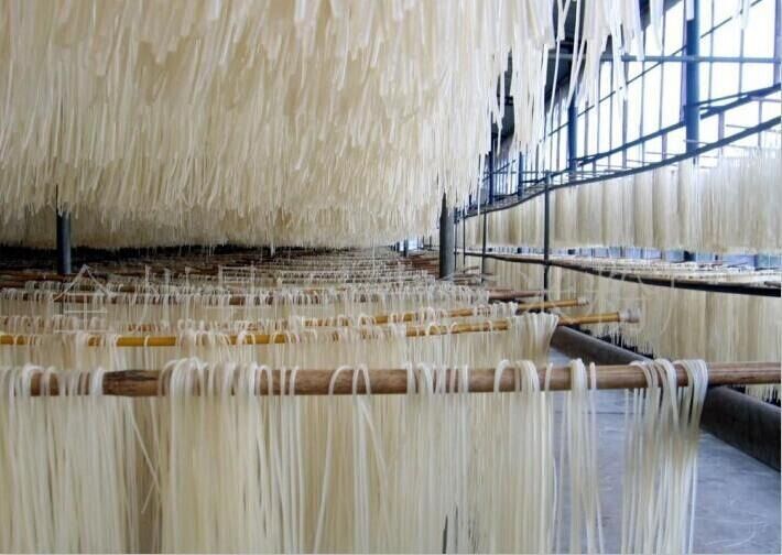 取大米60斤用凈水浸泡1-2小時,用手一搓就爛就可磨成米漿(也可將大米浸泡30分鐘,然后陰干表面水分磨成米粉,再用米粉調成米漿)。筋力源0.8斤與40斤淀粉干拌勻,加入米漿和勻,補充水分至總量45斤,和面糊至自然攤開為準。然后將和好的面糊放入自熟米線機擠絲、風扇降溫,再放入涼棚熟化8-12小時、用水浸泡20-50分鐘,然后搓散、陰干表面水分、包裝、銷售。