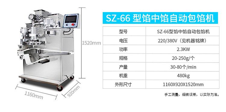 SZ-65型多功能自動包餡機采用臥式輸面、立式輸餡系統,運行流暢,效率高??缮a豆沙、蓮蓉、五仁餡等較干餡料的包餡類產品,制出的產品餡、皮比例可任意調整,制品大小統一,外形美觀。